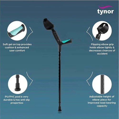 Tynor Elbow Crutch Adjustable is a sophisticated walking aid that provides total weight bearing when one or both legs get physically challenged because of a nervous disorder, fracture, disease, injury, etc. More and more professionals prefer the usage of an elbow crutch over the conventional Axillary crutch because of greater confidence of the patient, lesser fatigue, and trendy appearance.
