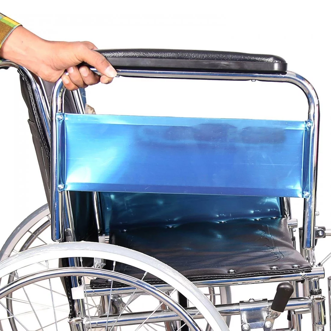 MS Chrome frame with 8″ PVC castor, 24″solid wheel, Flip up and mobile armrest and elevating footrest.